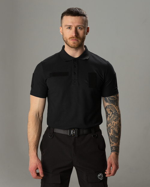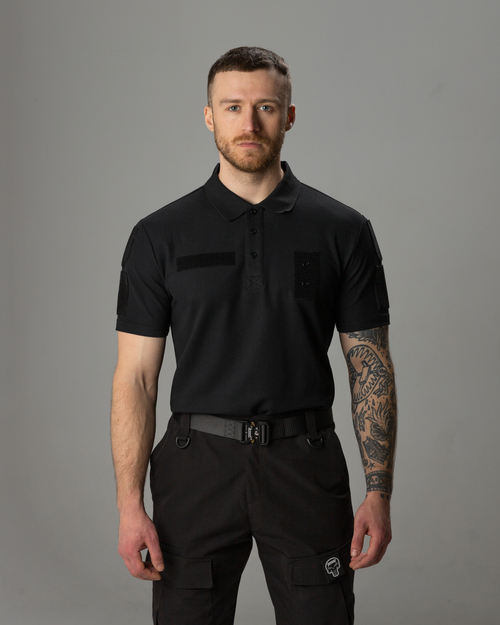 Покращену версію футболки поло BEZET 2.0 у чорному кольорі, спеціально розроблену для поліцейських сил. Ця модель відрізняється від попередньої наявністю вбудованих отворів під житон на грудях, що робить її ще більш функціональною для поліцейських, які використовують бронежилети. Виготовлена з високоякісних матеріалів, ця футболка забезпечує комфорт та довговічність в умовах повсякденного використання на службі. Чорний колір і стриманий дизайн підкреслюють професіоналізм і авторитет поліцейських, а тактичні елементи роблять її ідеальним вибором для службового використання у будь-яких ситуаціях.